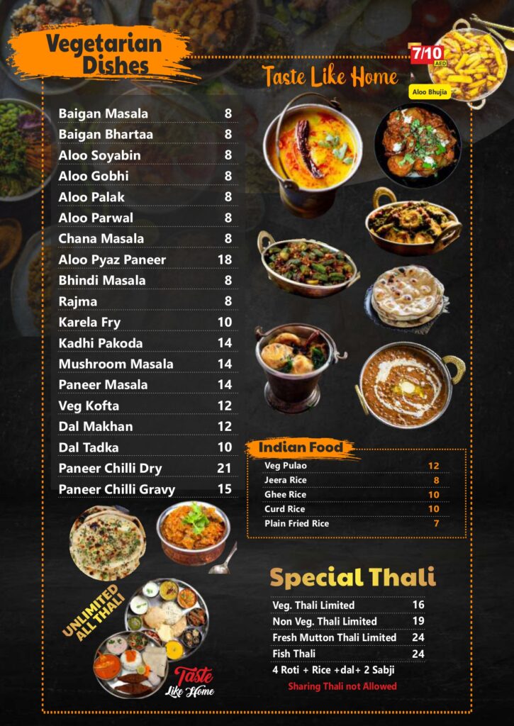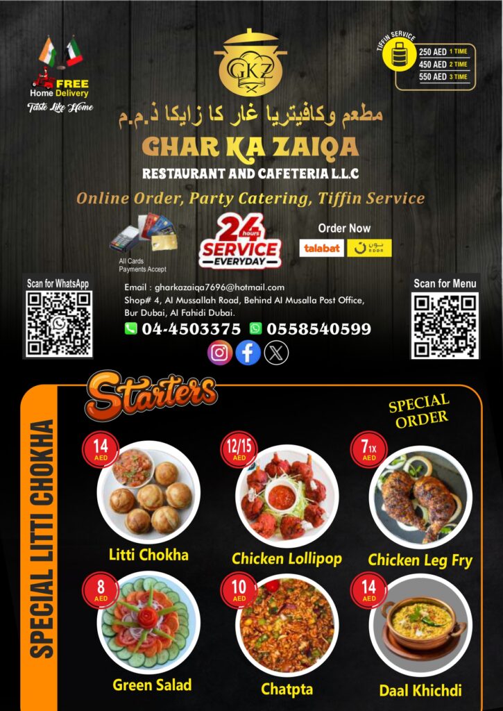 From sizzling tandoori delights to rich biryanis and comforting vegetarian curries, every dish at Ghar Ka Zaiqa Restaurant & Cafeteria L.L.C. is made fresh, using authentic Indian spices and homestyle recipes. Whether you’re craving a hearty meal or a quick bite, our menu brings the real taste of India straight to your plate.
